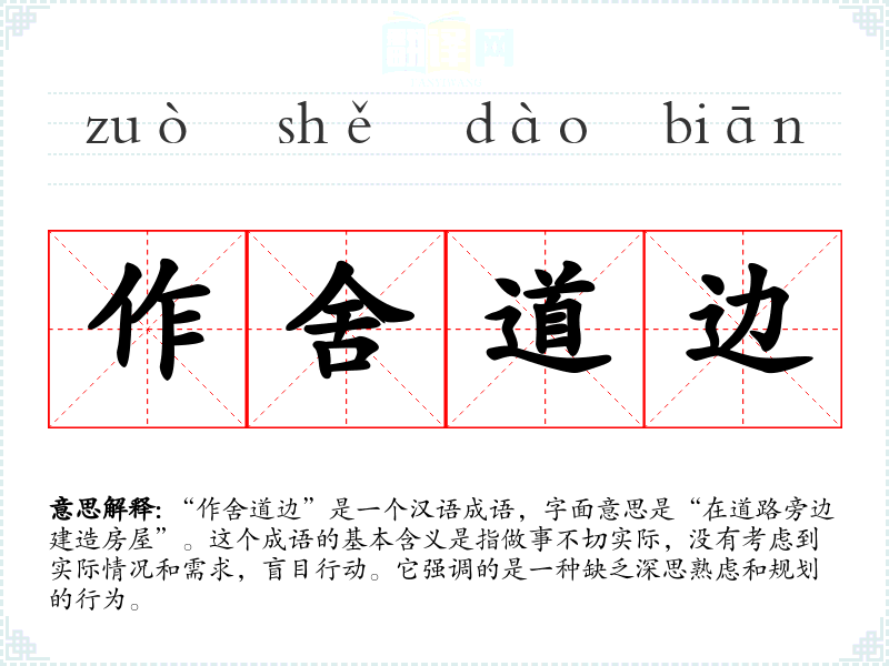 在文学作品中,“作舍道边”常用来讽刺那些不考虑后果、盲目行动的人。在口语中,这个成语可以用来形容某人的计划或行为缺乏合理性。在专业领域,如城市规划或建筑设计中,这个成语可以用来批评那些不考虑环境因素和实际需求的设计方案。
