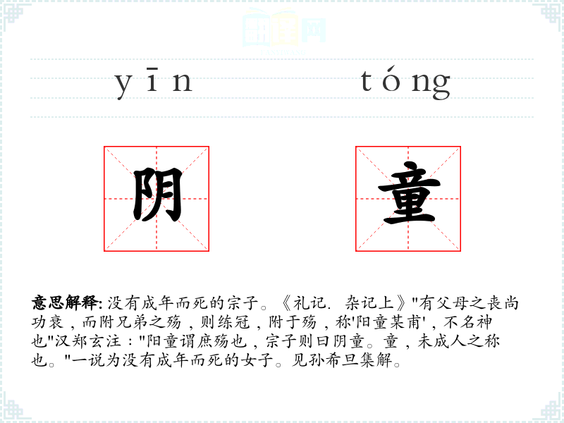 1.没有成年而死的宗子。《礼记.杂记上》"有父母之丧尚功衰﹐而附兄弟之殇﹐则练冠﹐附于殇﹐称'阳童某甫'﹐不名神也"汉郑玄注﹕"阳童谓庶殇也﹐宗子则曰阴童。童﹐未成人之称也。"一说为没有成年而死的女子。见孙希旦集解。