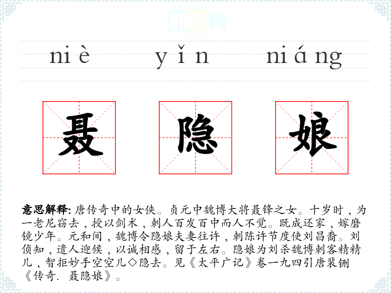 1.唐传奇中的女侠。贞元中魏博大将聂锋之女。十岁时﹐为一老尼窃去﹐授以剑术﹐刺人百发百中而人不觉。既成还家﹐嫁磨镜少年。元和间﹐魏博令隐娘夫妻往许﹐刺陈许节度使刘昌裔。刘侦知﹐遣人迎候﹐以诚相感﹐留于左右。隐娘为刘杀魏博刺客精精儿﹐智拒妙手空空儿◇隐去。见《太平广记》卷一九四引唐裴铏《传奇.聂隐娘》。