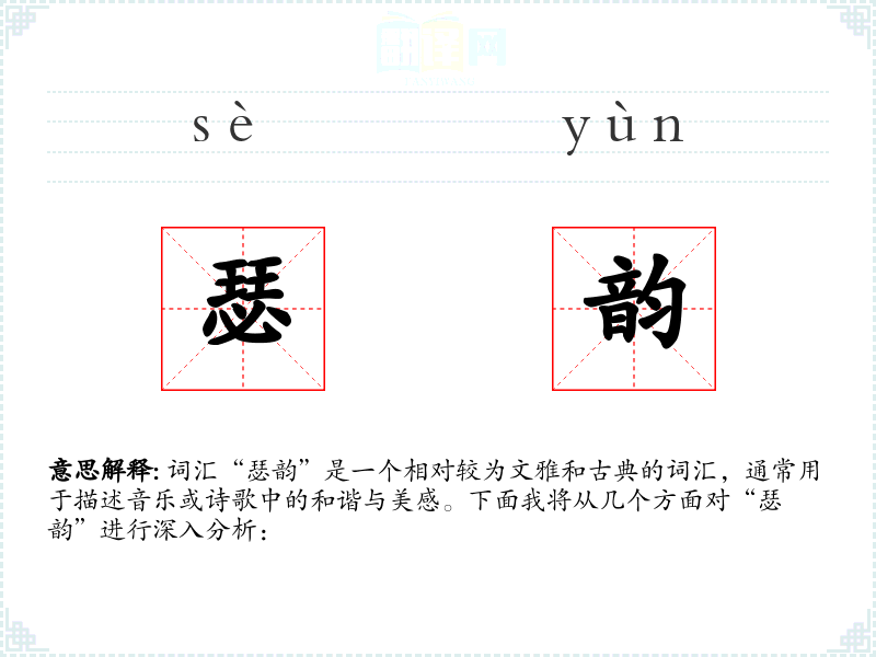 词汇“瑟韵”是一个相对较为文雅和古典的词汇,通常用于描述音乐或诗歌中的和谐与美感。下面我将从几个方面对“瑟韵”进行深入分析: