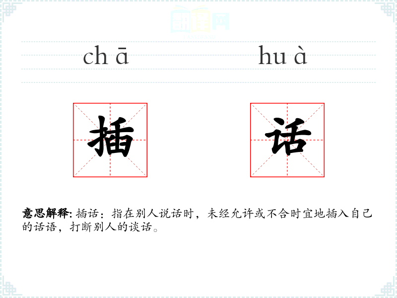 插话:指在别人说话时,未经允许或不合时宜地插入自己的话语,打断别人的谈话。
