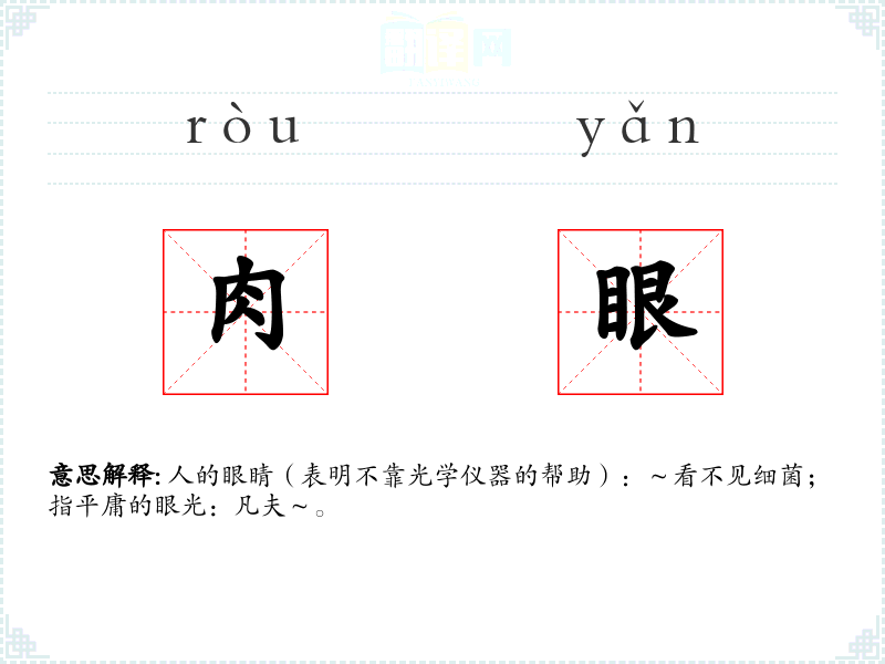 人的眼睛(表明不靠光学仪器的帮助):~看不见细菌;指平庸的眼光:凡夫~。