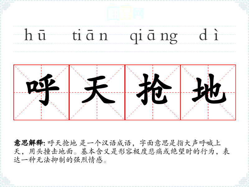呼天抢地 是一个汉语成语,字面意思是指大声呼喊上天,用头撞击地面。基本含义是形容极度悲痛或绝望时的行为,表达一种无法抑制的强烈情感。