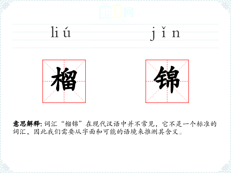 词汇“榴锦”在现代汉语中并不常见,它不是一个标准的词汇,因此我们需要从字面和可能的语境来推测其含义。