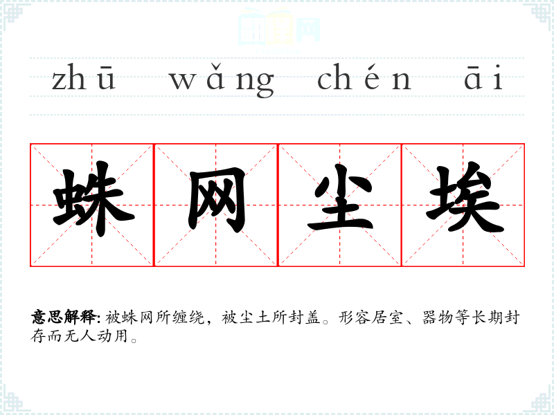 被蛛网所缠绕,被尘土所封盖。形容居室、器物等长期封存而无人动用。