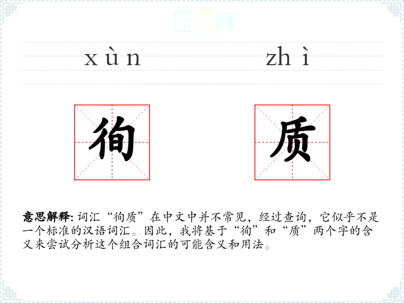 词汇“徇质”在中文中并不常见,经过查询,它似乎不是一个标准的汉语词汇。因此,我将基于“徇”和“质”两个字的含义来尝试分析这个组合词汇的可能含义和用法。