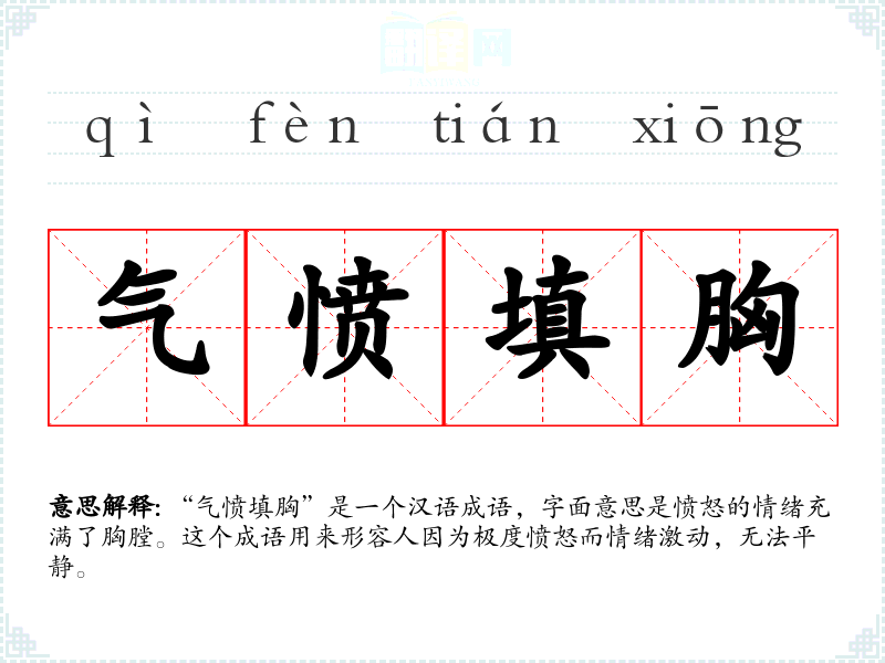 “气愤填胸”是一个汉语成语,字面意思是愤怒的情绪充满了胸膛。这个成语用来形容人因为极度愤怒而情绪激动,无法平静。