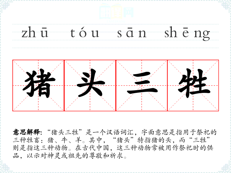 “猪头三牲”是一个汉语词汇,字面意思是指用于祭祀的三种牲畜:猪、牛、羊。其中,“猪头”特指猪的头,而“三牲”则是指这三种动物。在古代**,这三种动物常被用作祭祀时的供品,以示对神灵或祖先的尊敬和祈求。