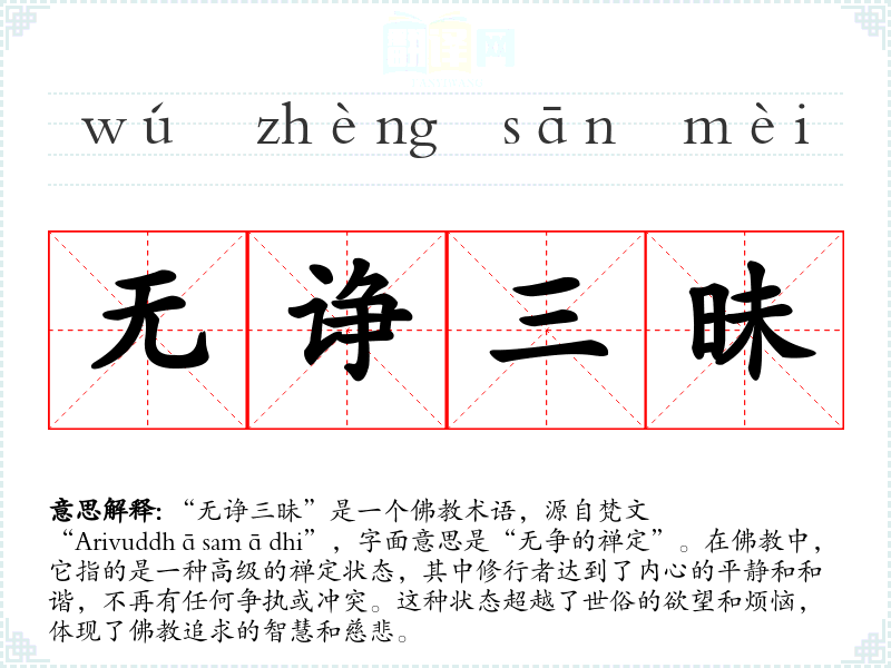 “无诤三昧”源自梵文“Arivuddhāsamādhi”,其中“Arivuddhā”意为“无争”,“samādhi”意为“禅定”。随着的传播,这个词汇被引入到中文中,保留了其原始的和哲学意义。
