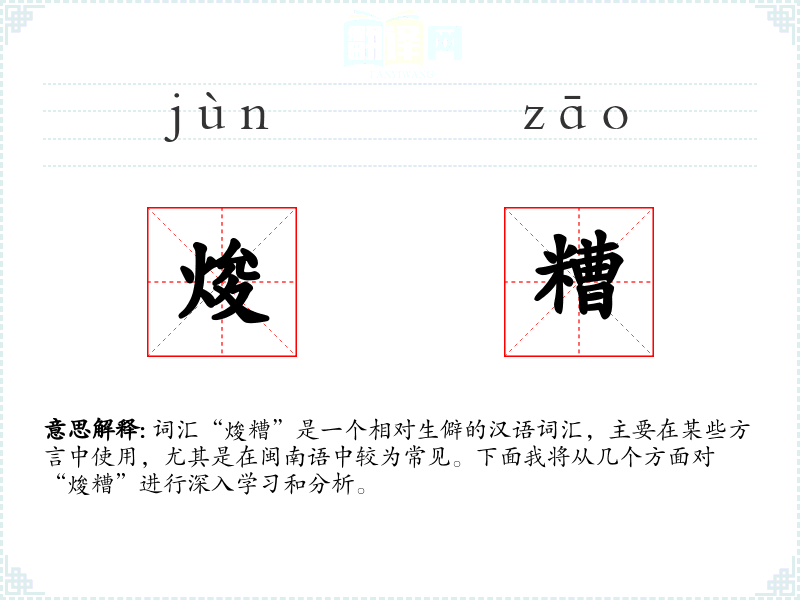 词汇“焌糟”是一个相对生僻的汉语词汇,主要在某些方言中使用,尤其是在闽南语中较为常见。下面我将从几个方面对“焌糟”进行深入学习和分析。