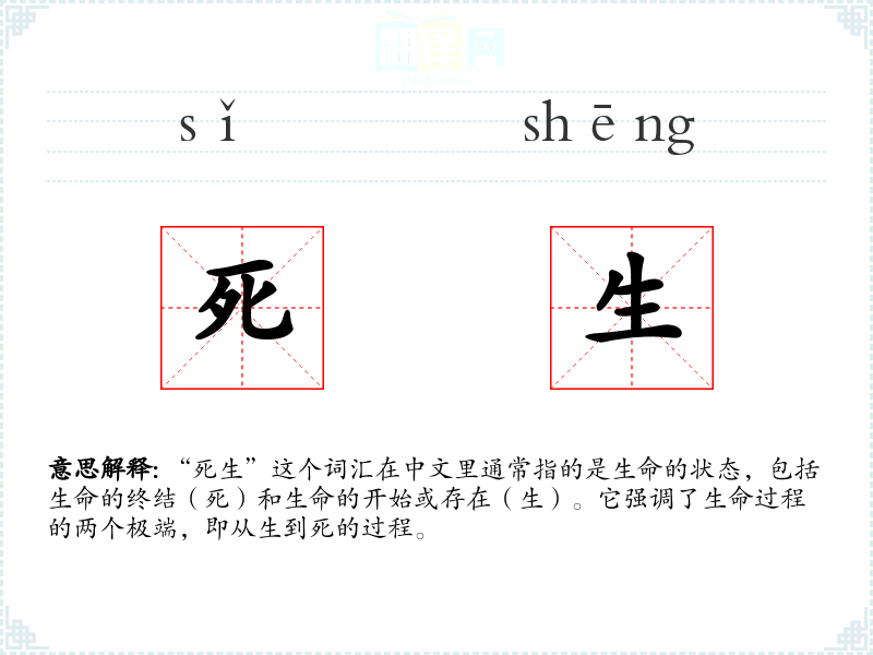 “死生”这个词汇在中文里通常指的是生命的状态,包括生命的终结(死)和生命的开始或存在(生)。它强调了生命过程的两个极端,即从生到死的过程。