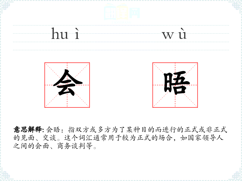 - 反义词:分离、离别(这些词汇与“会晤”在意义上相对立,但并不直接对应)