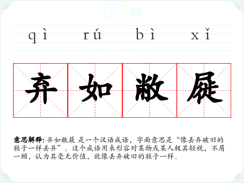 弃如敝屣 这个成语在表达对某物的极度轻视时非常有力。了解其词源和使用背景,可以帮助我们更好地理解和运用这个成语,同时也提醒我们在生活中应更加珍惜和尊重周围的人和物。