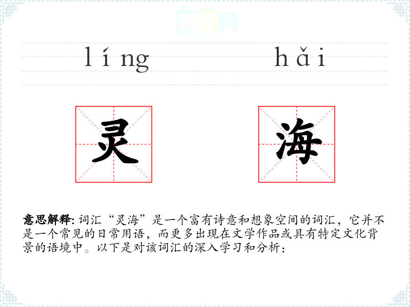词汇“灵海”是一个富有诗意和想象空间的词汇,它并不是一个常见的日常用语,而更多出现在文学作品或具有特定文化背景的语境中。以下是对该词汇的深入学*和分析: