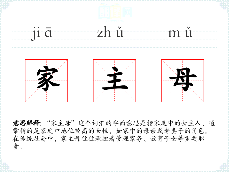 “家主母”这个词汇的字面意思是指家庭中的女主人,通常指的是家庭中地位较高的女性,如家中的母亲或者妻子的角色。在传统社会中,家主母往往承担着管理家务、教育子女等重要职责。