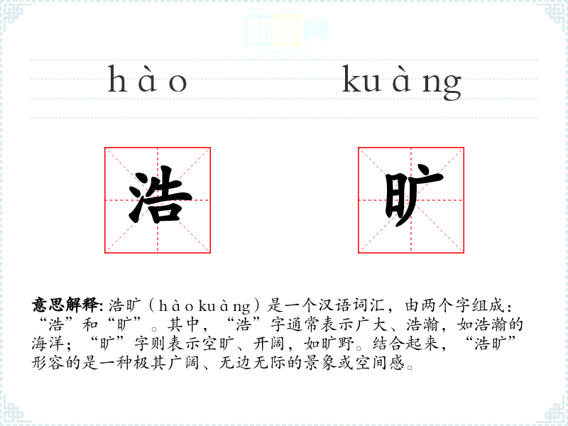 “浩”字最早见于《说文解字》,原意为水大,后引申为广大的意思。“旷”字则源于古代对空旷地的描述,逐渐演变为形容空间的开阔。两个字的结合,强化了广阔无边的意象。