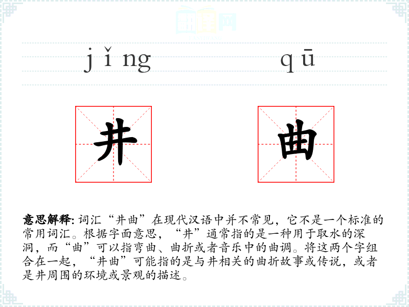关于词源与演变,由于“井曲”不是一个常用词汇,它的词源和历史演变不明确。这个词可能是某个特定地区或文化中的方言词汇,或者是某个作者为了文学创作而创造的词汇。