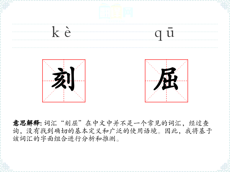 “刻”通常指雕刻、刻画或时间上的刻度,而“屈”则有弯曲、屈服或委屈的含义。结合起来,“刻屈”可能指的是通过雕刻或其他方式使物体弯曲或变形,或者在某种程度上表示被迫屈服或感到委屈。