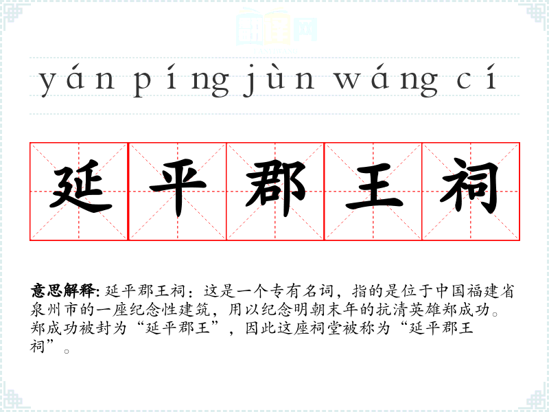 延平郡王祠:这是一个专有名词,指的是位于**福建省泉州市的一座纪念性建筑,用以纪念明朝末年的抗清英雄郑成功。郑成功被封为“延平郡王”,因此这座祠堂被称为“延平郡王祠”。