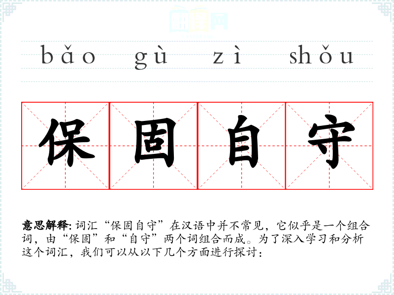 词汇“保固自守”在汉语中并不常见,它似乎是一个组合词,由“保固”和“自守”两个词组合而成。为了深入学习和分析这个词汇,我们可以从以下几个方面进行探讨:
