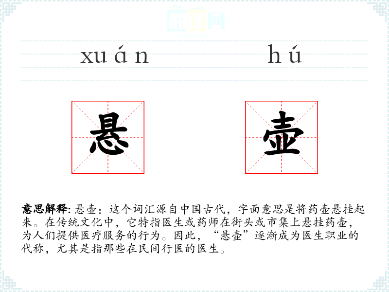 悬壶:这个词汇源自**古代,字面意思是将药壶悬挂起来。在传统文化中,它特指医生或药师在街头或市集上悬挂药壶,为人们提供医疗服务的行为。因此,“悬壶”逐渐成为医生职业的代称,尤其是指那些在民间行医的医生。