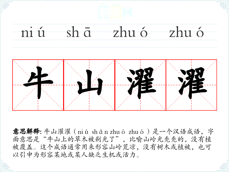 牛山濯濯(niú shān zhuó zhuó)是一个汉语成语,字面意思是“牛山上的草木被剃光了”,比喻山岭光秃秃的,没有植被覆盖。这个成语通常用来形容山岭荒凉,没有树木或植被,也可以引申为形容某地或某人缺乏生机或活力。