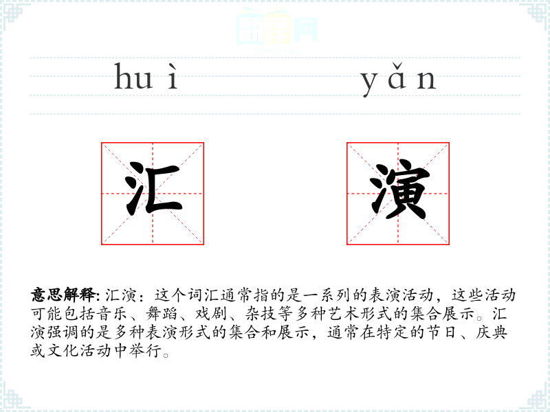 “汇演”一词由“汇”和“演”两个字组成。“汇”字有聚集、集合的意思,“演”字则指表演、演示。随着文化活动的多样化,汇演逐渐成为一个常用词汇,用以描述包含多种艺术形式的表演活动。
