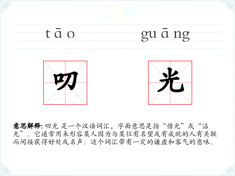 叨光 的词源较为传统,源自汉语中的“叨”字,意为“借”或“沾”,与“光”结合,形成了一个表示间接获得好处的词汇。在古代文献中已有使用,现代汉语中仍然保留并使用。