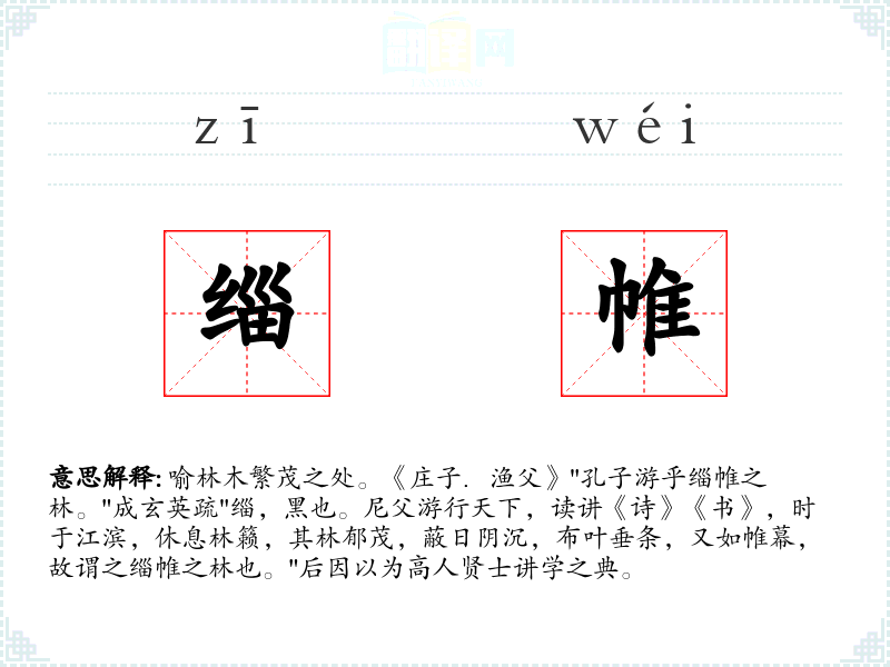 1.喻林木繁茂之处。《庄子.渔父》"孔子游乎缁帷之林。"成玄英疏"缁,黑也。尼父游行天下,读讲《诗》《书》,时于江滨,休息林籁,其林郁茂,蔽日阴沉,布叶垂条,又如帷幕,故谓之缁帷之林也。"后因以为高人贤士讲学之典。
