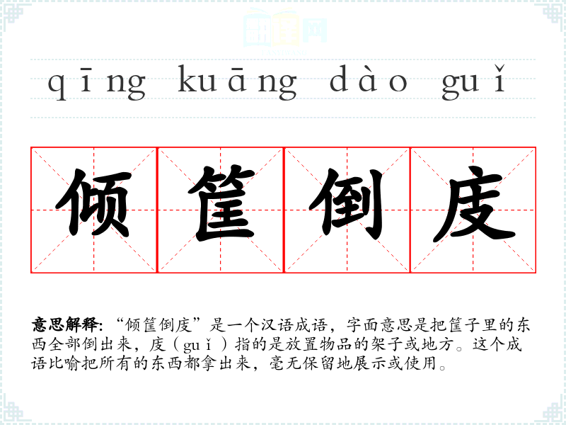 “倾筐倒庋”是一个汉语成语,字面意思是把筐子里的东西全部倒出来,庋(guǐ)指的是放置物品的架子或地方。这个成语比喻把所有的东西都拿出来,毫无保留地展示或使用。