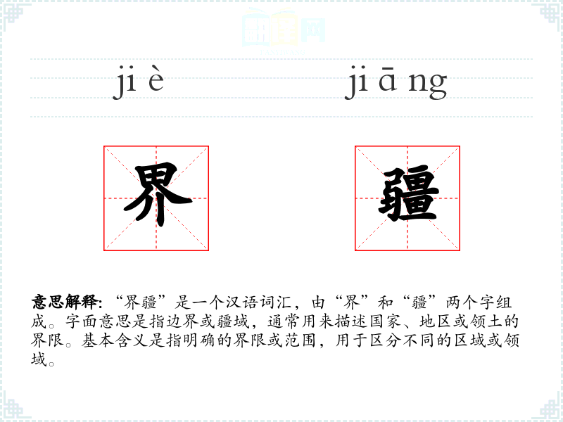 “界”字最早见于甲骨文,原意是指田地的界限。“疆”字则来源于“弓”和“土”,原意是用弓测量土地的界限。两者结合,形成了“界疆”这个词汇,用于描述更广阔的地理和政治界限。