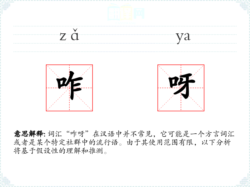 词汇“咋呀”在汉语中并不常见,它可能是一个方言词汇或者是某个特定社群中的流行语。由于其使用范围有限,以下分析将基于假设性的理解和推测。