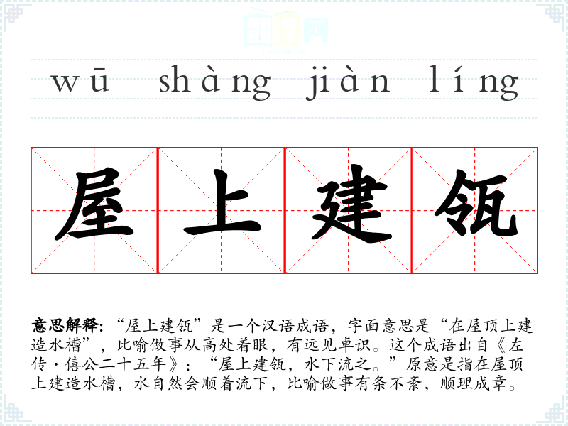 “屋上建瓴”是一个汉语成语,字面意思是“在屋顶上建造水槽”,比喻做事从高处着眼,有远见卓识。这个成语出自《左传·僖公二十五年》:“屋上建瓴,水下流之。”原意是指在屋顶上建造水槽,水自然会顺着流下,比喻做事有条不紊,顺理成章。