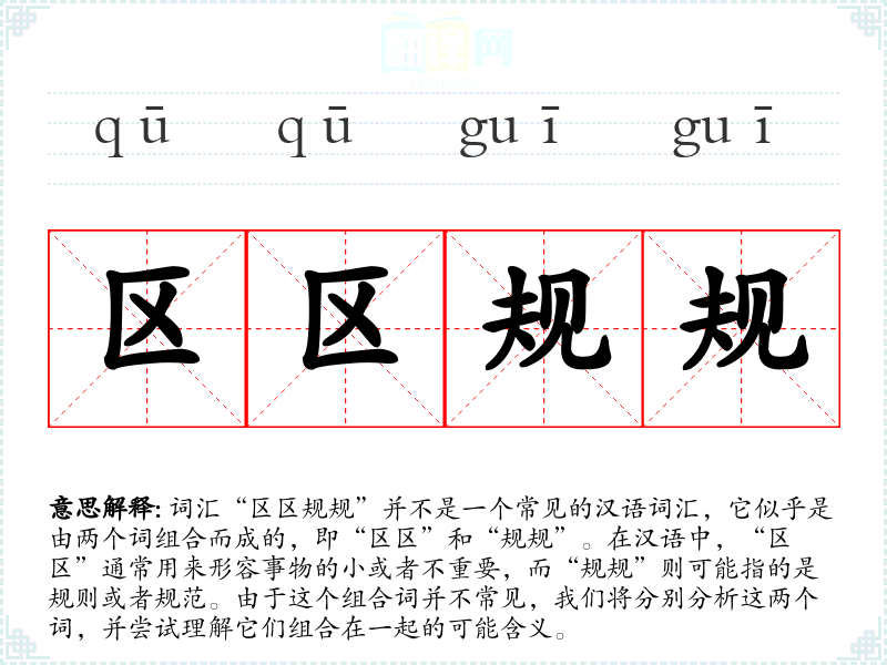 词汇“区区规规”并不是一个常见的汉语词汇,它似乎是由两个词组合而成的,即“区区”和“规规”。在汉语中,“区区”通常用来形容事物的小或者不重要,而“规规”则可能指的是规则或者规范。由于这个组合词并不常见,我们将分别分析这两个词,并尝试理解它们组合在一起的可能含义。