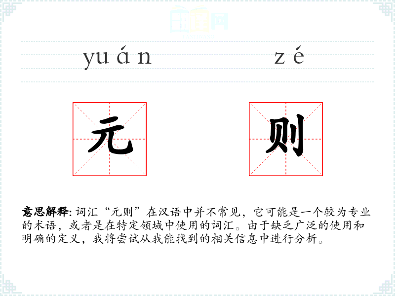 词汇“元则”在汉语中并不常见,它可能是一个较为专业的术语,或者是在特定领域中使用的词汇。由于缺乏广泛的使用和明确的定义,我将尝试从我能找到的相关信息中进行分析。