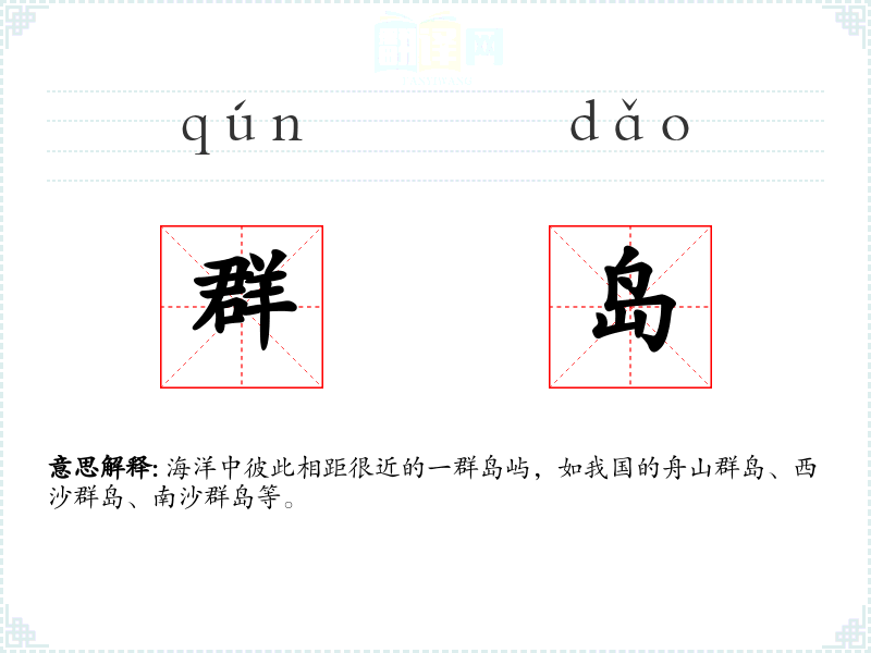 海洋中彼此相距很近的一群岛屿,如我国的舟山群岛、西沙群岛、南沙群岛等。