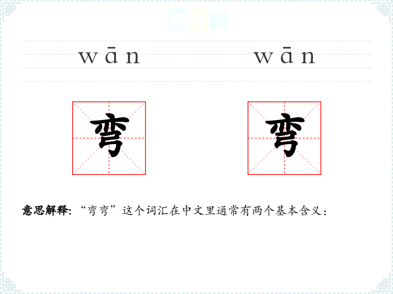 - 形容词:描述物体或线条的弯曲状态,如“弯弯的月亮”。