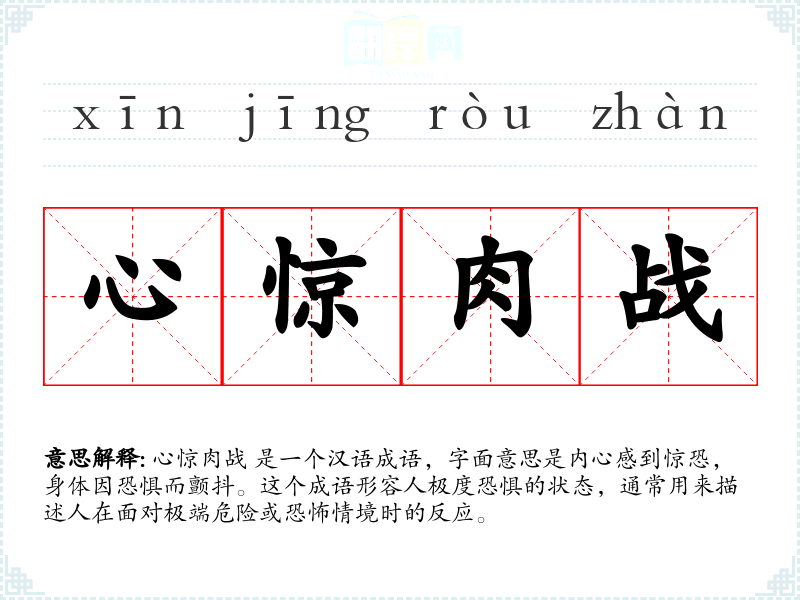 心惊肉战 是一个汉语成语,字面意思是内心感到惊恐,身体因恐惧而颤抖。这个成语形容人极度恐惧的状态,通常用来描述人在面对极端危险或恐怖情境时的反应。