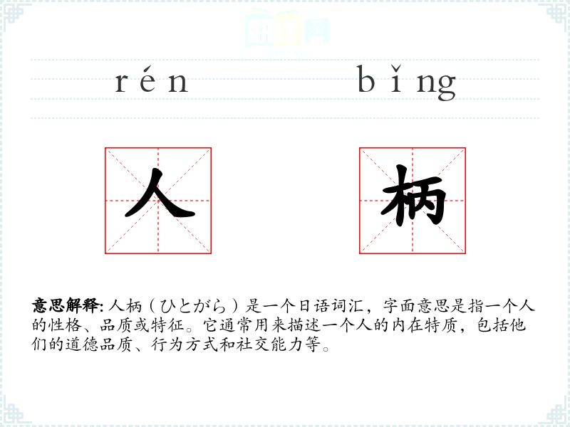 人柄(ひとがら)是一个日语词汇,字面意思是指一个人的性格、品质或特征。它通常用来描述一个人的内在特质,包括他们的道德品质、行为方式和社交能力等。