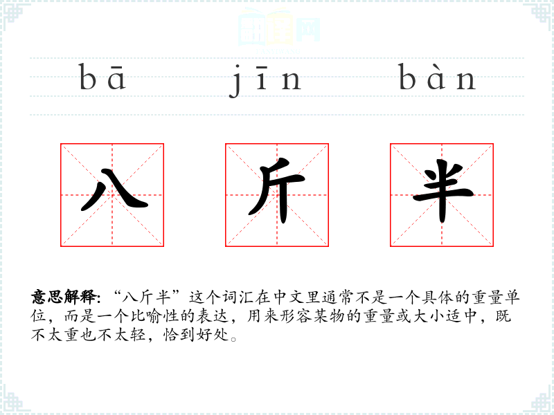 “八斤半”这个词汇在中文里通常不是一个具体的重量单位,而是一个比喻性的表达,用来形容某物的重量或大小适中,既不太重也不太轻,恰到好处。