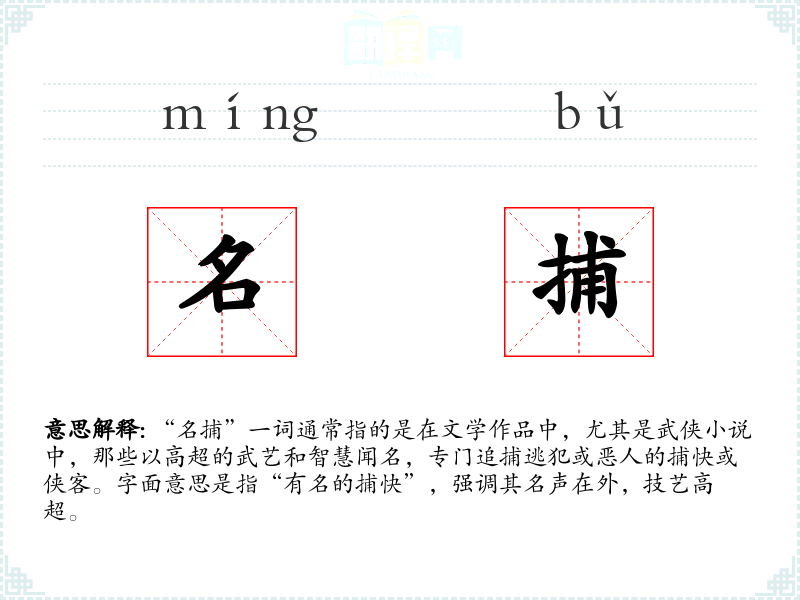 “名捕”一词通常指的是在文学作品中,尤其是武侠小说中,那些以高超的武艺和智慧闻名,专门追捕逃犯或恶人的捕快或侠客。字面意思是指“有名的捕快”,强调其名声在外,技艺高超。