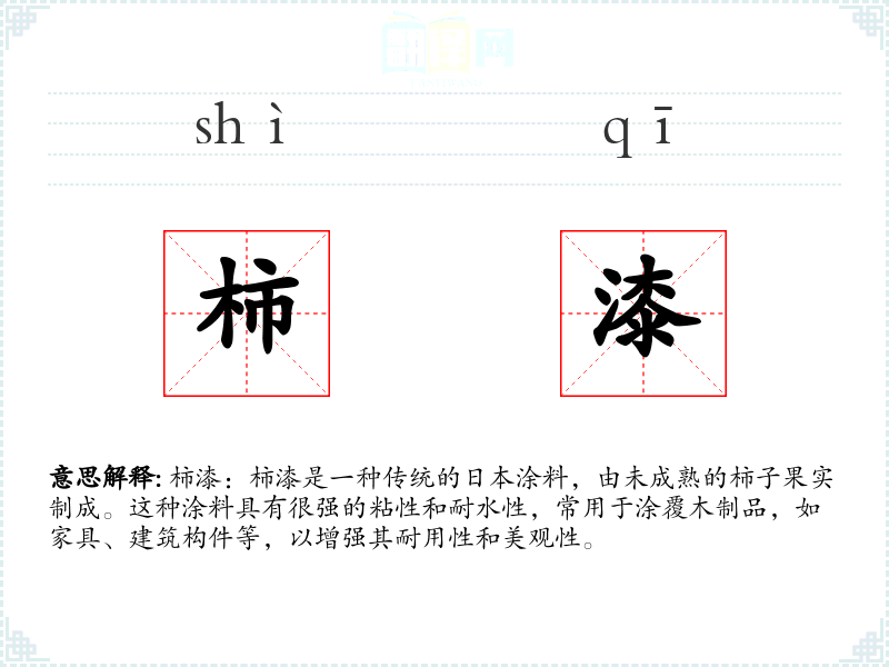 同义词:漆料、涂料、木漆 反义词:无(柿漆是一种特定材料,没有直接的反义词)