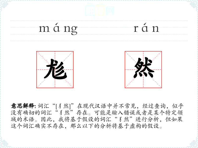 假设“犭然”是一个形容词,可能来源于“犭”(犬的偏旁),意味着与犬类相关的某种状态或特征。字面意思可能是指像犬一样的,或者与犬有关的某种特性。