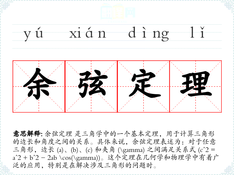 同义词:三角形定理、几何定理 反义词:无直接反义词,但可以与正弦定理(另一个三角学基本定理)相对比。