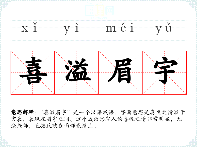 “喜溢眉宇”是一个汉语成语,字面意思是喜悦之情溢于言表,表现在眉宇之间。这个成语形容人的喜悦之情非常明显,无法掩饰,直接反映在面部表情上。