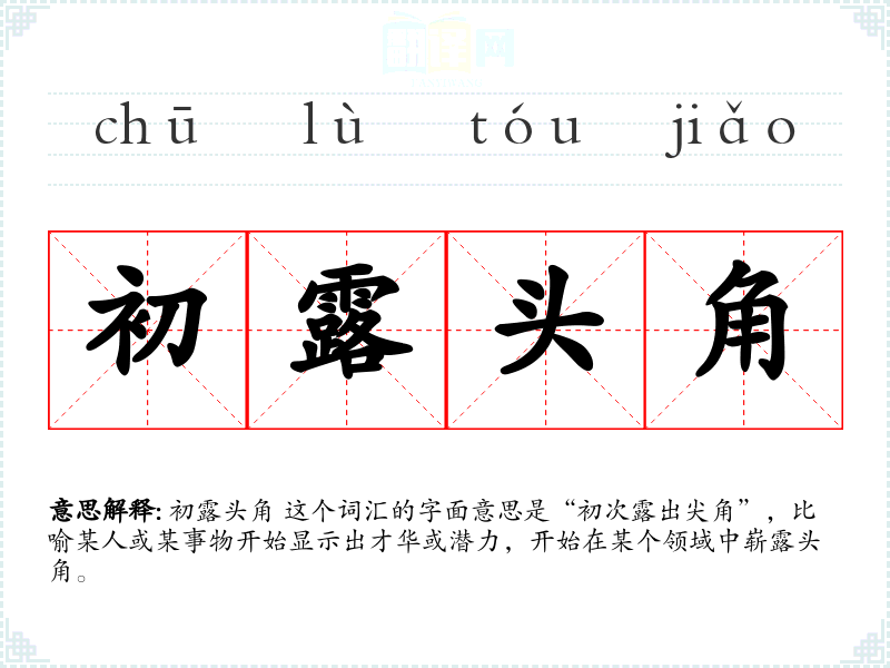 初露头角 这个词汇的字面意思是“初次露出尖角”,比喻某人或某事物开始显示出才华或潜力,开始在某个领域中崭露头角。