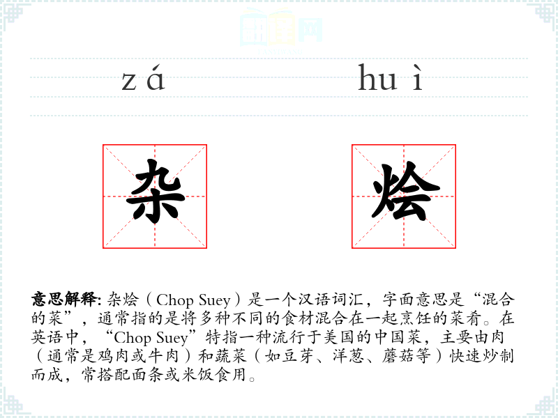 “杂烩”一词源自汉语,后来被英语借用,形成了“Chop Suey”这一表达。在美国,“Chop Suey”成为了一种特定的**菜,而在其他语境中,“杂烩”更多地被用来比喻混合或多样化的概念。
