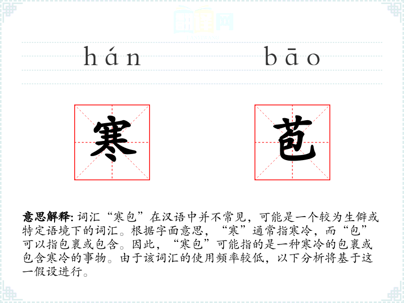 词汇“寒包”在汉语中并不常见,可能是一个较为生僻或特定语境下的词汇。根据字面意思,“寒”通常指寒冷,而“包”可以指包裹或包含。因此,“寒包”可能指的是一种寒冷的包裹或包含寒冷的事物。由于该词汇的使用频率较低,以下分析将基于这一假设进行。
