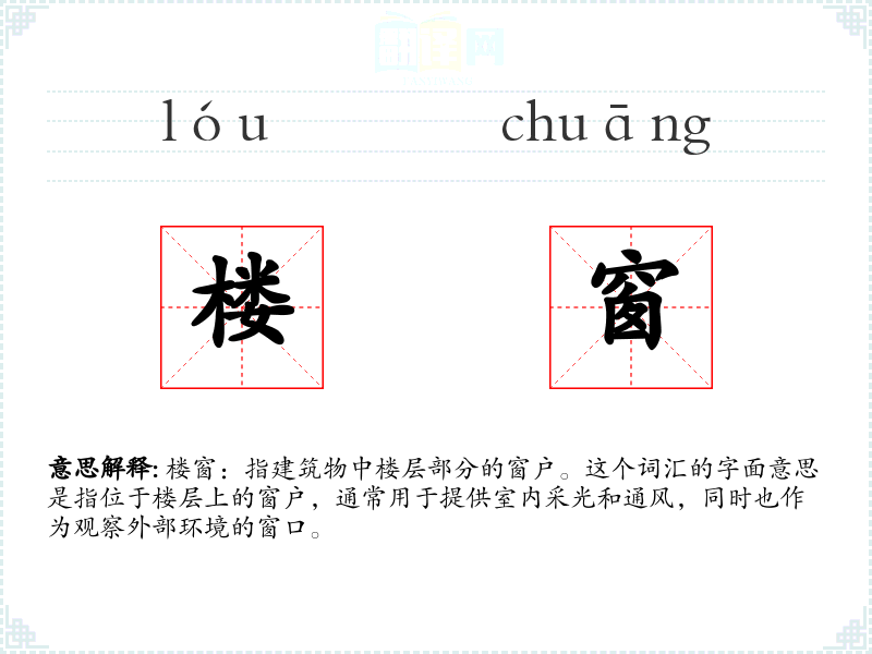 楼窗:指建筑物中楼层部分的窗户。这个词汇的字面意思是指位于楼层上的窗户,通常用于提供室内采光和通风,同时也作为观察外部环境的窗口。