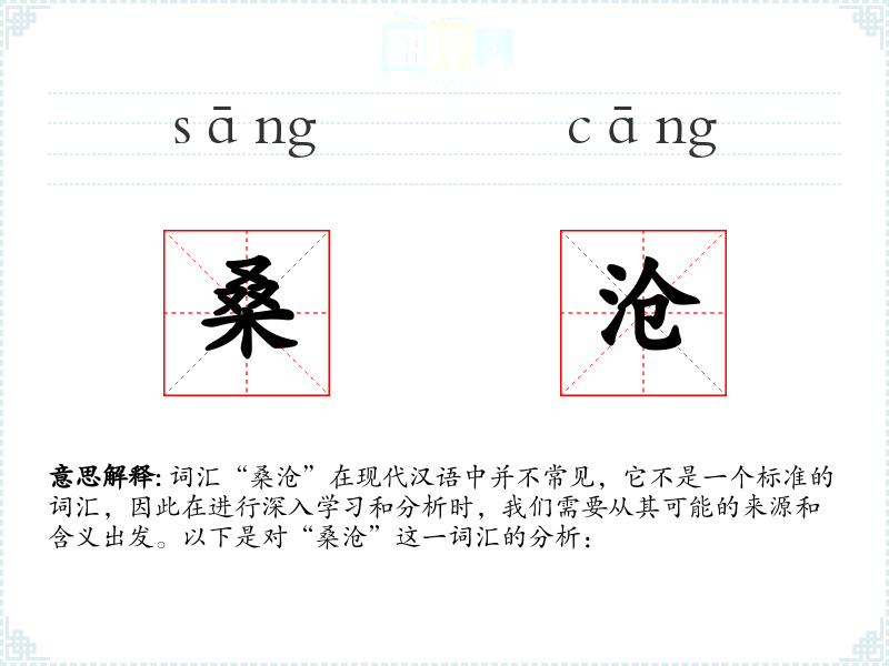 词汇“桑沧”在现代汉语中并不常见,它不是一个标准的词汇,因此在进行深入学*和分析时,我们需要从其可能的来源和含义出发。以下是对“桑沧”这一词汇的分析: